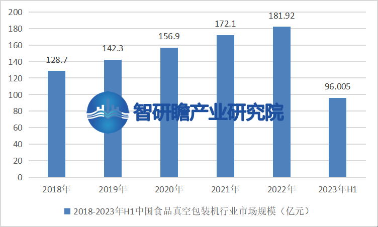统计数据显示,2018年中国食品真空包装机行业市场规模128.7亿元,2023年H1中国食品真空包装机行业市场规模96.005亿元。2018-2023年H1中国食品真空包装机行业市场规模如下: