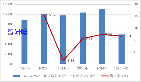 据智研瞻产业研究院统计显示,2020年中国家政服务行业市场规模8782.08亿元,2024年中国家政服务行业市场规模11105.69亿元,同比增长7.36%。2020-2025年中国家政服务行业市场规模如下: