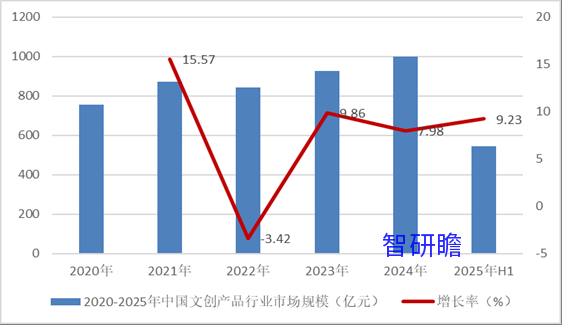 据智研瞻产业研究院统计显示,2020年中国文创产品行业市场规模755.12亿元,2024年中国文创产品行业市场规模999.82亿元,同比增长7.98%。2020-2025年中国文创产品行业市场规模如下: