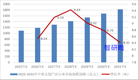 根据对中国文创产品市场的深入分析,智研瞻产业研究院预测,2025-2031年中国文创产品行业市场规模增长率在8%左右,2031年中国文创产品行业市场规模1821.30亿元,同比增长8.41%。2025-2031年中国文创产品行业市场规模预测如下: