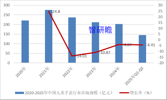 据智研瞻产业研究院统计显示,2020年中国儿童手表行业市场规模220.67亿元,2024年中国儿童手表行业市场规模202.49亿元,同比增长-4.07%。2020-2025年中国儿童手表行业市场规模如下:
