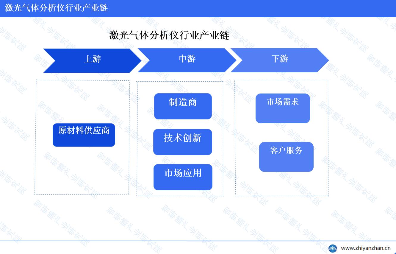 激光气体分析仪行业的全产业链可分为三个主要环节;首先,在上游环节,激光气体分析仪的生产依赖于一系列关键原材料,如用于制造传感器的特种材料、用于装置内部电子元件的半导体材料以及用于传输和储存数据的计算机硬件等。这些原材料主要由专业的原材料供应商提供,他们扮演着为激光气体分析仪制造商提供所需基础材料的角色。其次,在中游环节,激光气体分析仪的生产和研发主要由专业制造商负责。他们利用上游提供的原材料,生产出各种类型的激光气体分析仪,并进行持续的技术研发以提高设备的性能和降低生产成本。在这个阶段,产品的研发与生产密切相关,制造商需要同时注重技术创新与市场应用。最后,在下游环节,激光气体分析仪的销售和服务企业起着连接产品与市场需求的重要桥梁作用。他们负责将中游生产的产品推向市场,并为使用者提供安装、维护等服务。在这个阶段,企业需要掌握市场需求,了解用户需求,以便提供更贴合用户实际需求的服务。此外,激光气体分析仪行业的发展还与环保、新能源和医疗等多个行业密切相关。随着这些行业的快速发展,对激光气体分析仪的需求也将不断增长,从而为激光气体分析仪行业带来更广阔的市场前景。